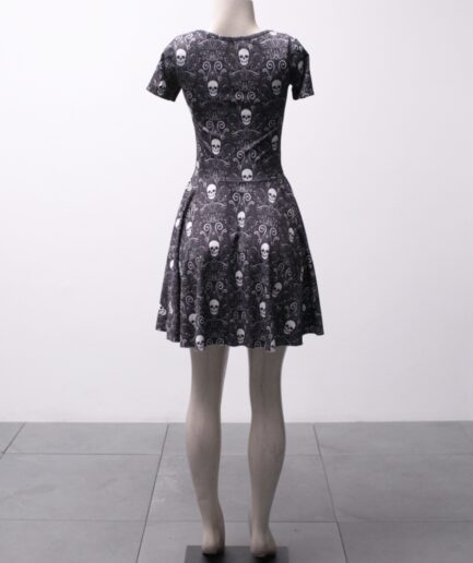 [PP/P] Vestido godê estampado com crânios e arabescos Reversa