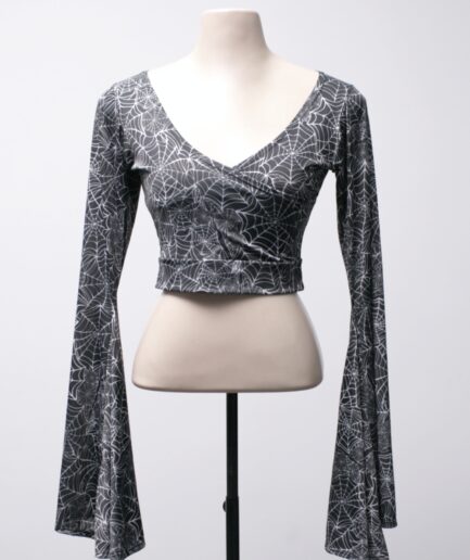 [P] Cropped manga flare com estampa de teias